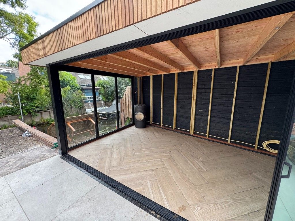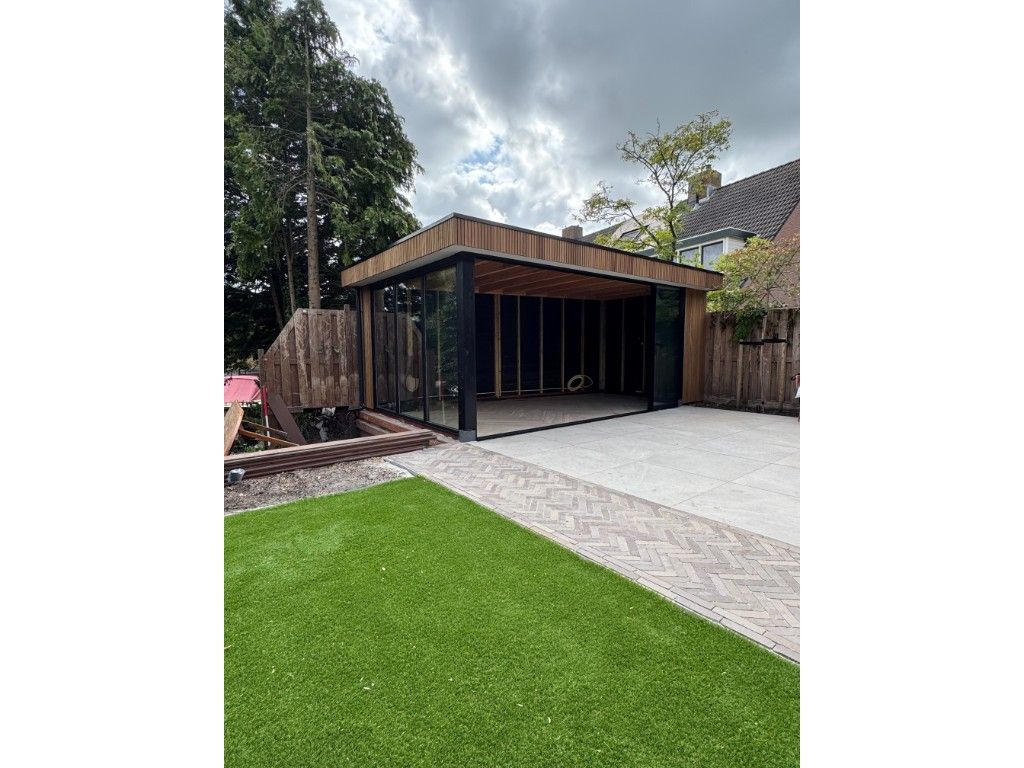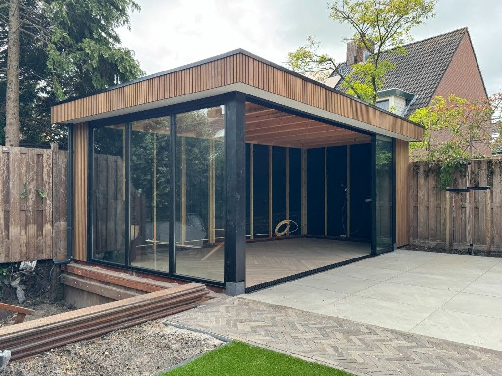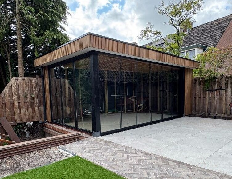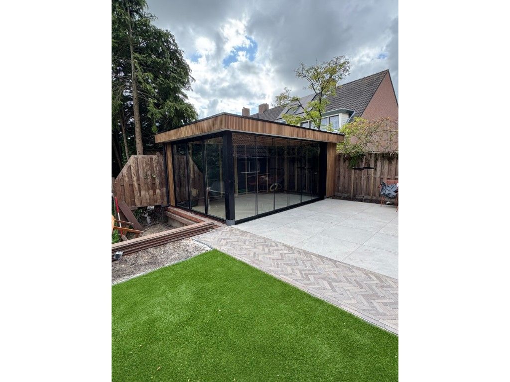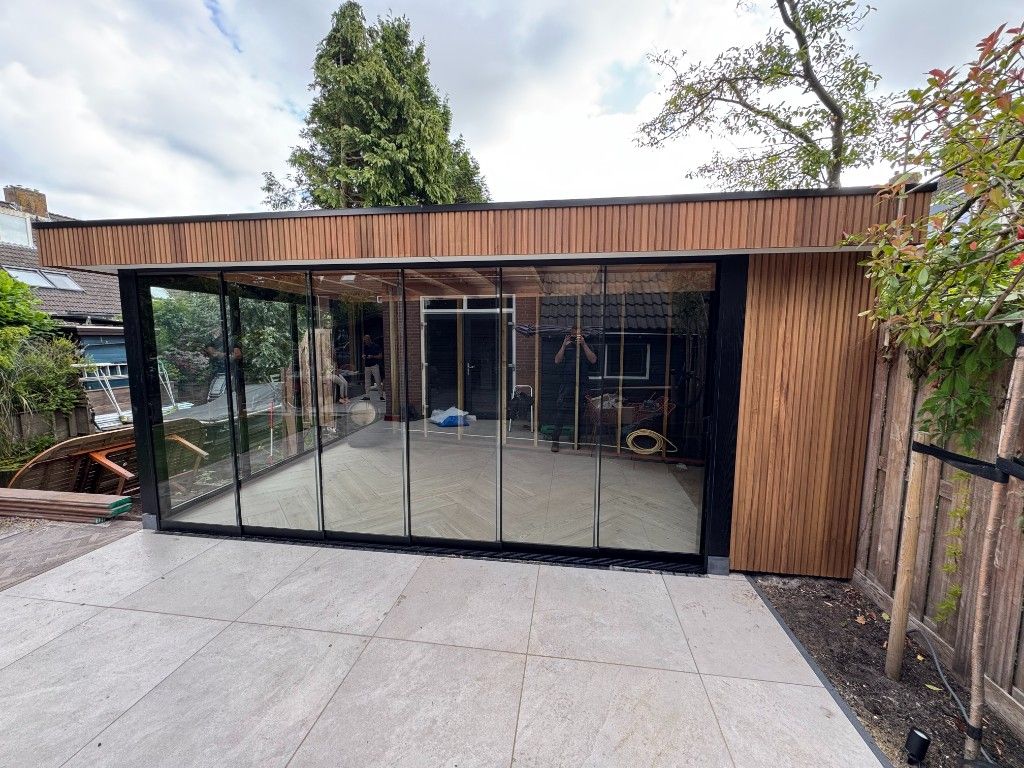 • tuinkamer met glasschuifwand met zwarte profielen 5m breed