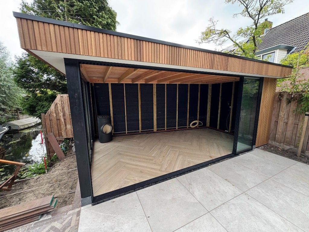 • achterwanden dicht met zwart bevelsiding rabat aan buitenzijde, binnenzijde tuinkamer ging klant zelf met witte platen afwerken.